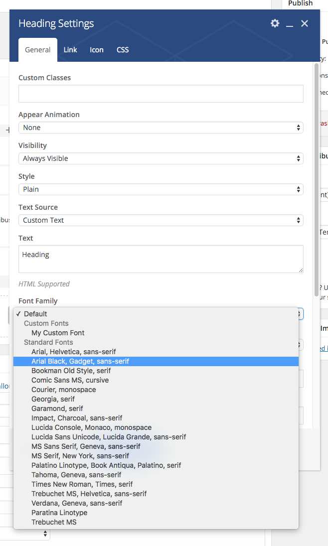 - Updated Optimized the font-family select option in various Total Visual Composer modules to make it much faster for the page builder and added support for custom fonts (when added via theme filters) – screenshot