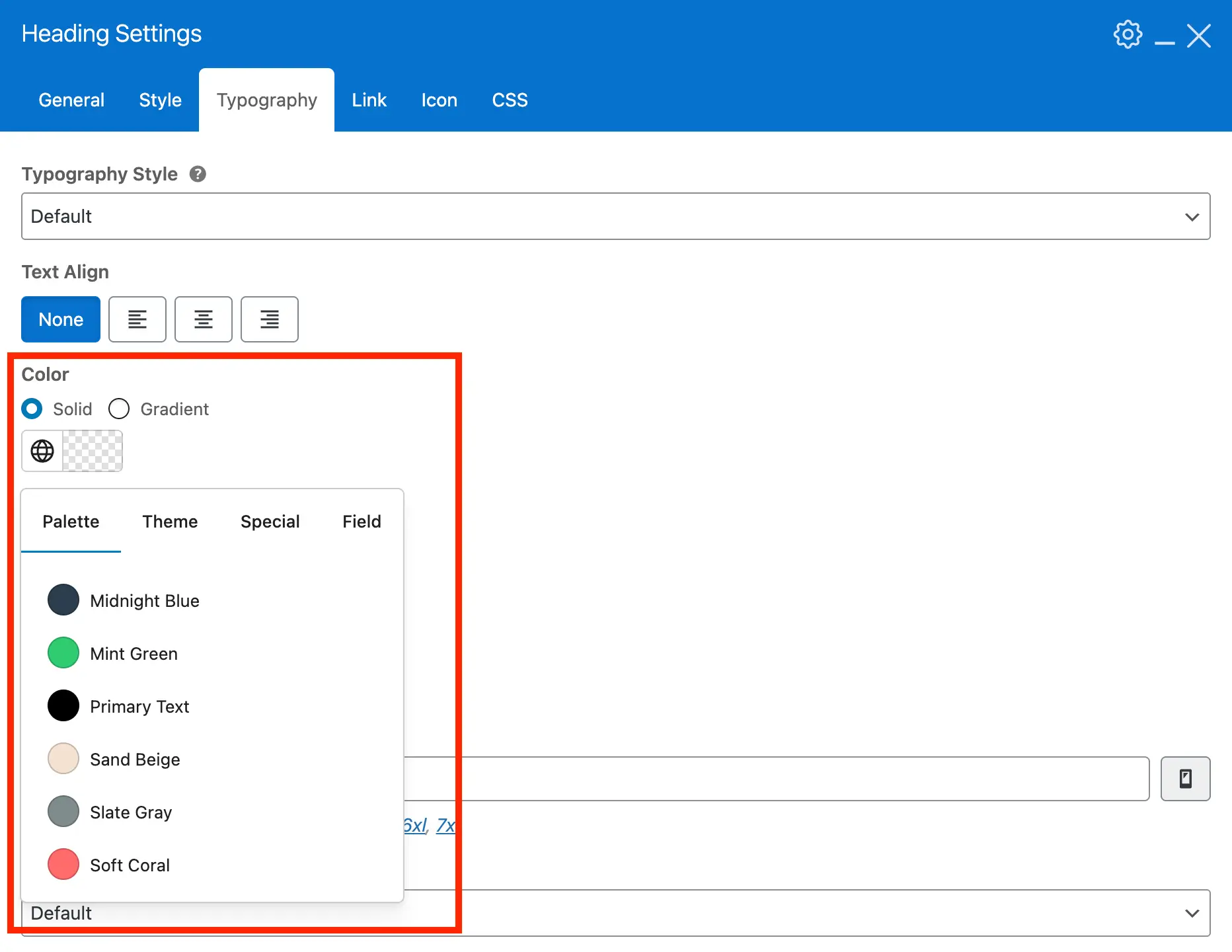 We’re aware that other platforms, like Gutenberg, include a gradient builder that lets users click within a container to add color stops. However, those tools are typically limited to custom colors. In Total, it’s essential that we support not only custom palette colors but also special options such as transparent.